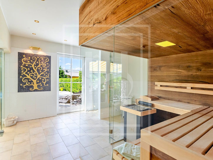 The inviting vestibule opens the view to a well-thought-out ensemble: a fitness room and sauna with garden access form the private spa. A self-contained apartment with a kitchenette, bathroom, and separate living/sleeping area offers versatile use—whether for guests, staff, or as a home office. The level is complemented by utility rooms and storage rooms, as well as a utility area with direct access to the garage.